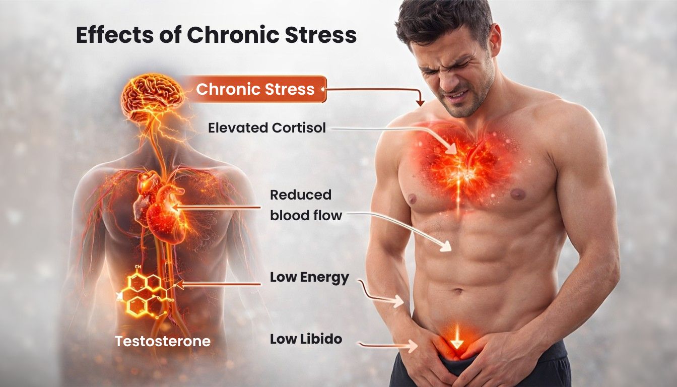 You may feel mentally fine, but physiologically, your body stays in fight-or-flight mode, keeping cortisol elevated and blood vessels tight. Over time, this directly suppresses arousal.