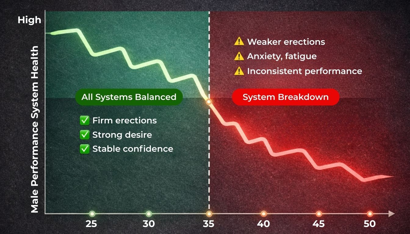 Even if you eat clean, exercise, and look healthy on the outside, your internal performance system may already be under strain. Stress chemistry, blood flow, and testosterone don’t fail overnight. They erode quietly until performance becomes inconsistent, confidence takes a hit, and frustration sets in.